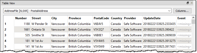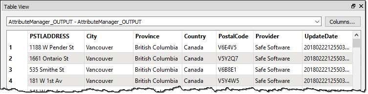 Open the containing folder to check the output has been written. Inspect the data in the FME Data Inspector. The output (in the Table View window) should look like this: