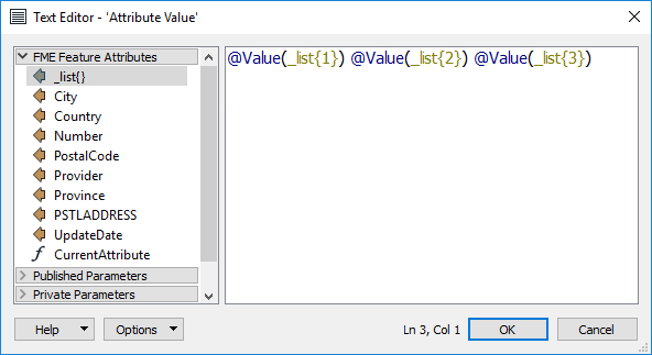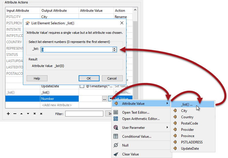 Locate _list{} in the FME Feature Attributes menu and carry out the following steps: