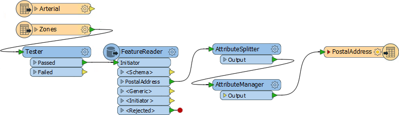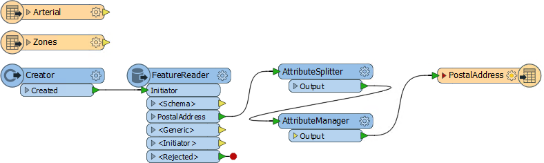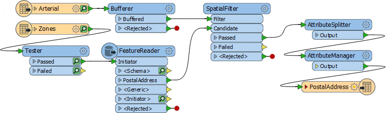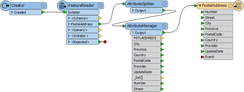 This way the AttributeSplitter and AttributeManager are operating only on filtered features. If the SpatialFilter was connected after the AttributeManager, then data would be getting processed and then discarded.