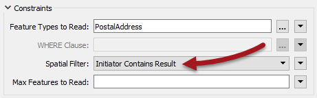 Now inspect the FeatureReader's parameters. Set the Spatial Filter parameter to Initiator Contains Result: