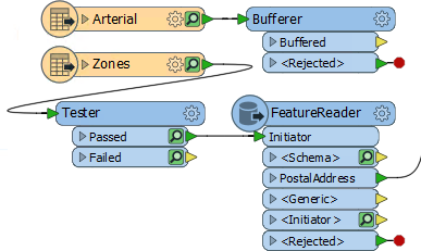 The SpatialFilter does not have a test for "within X distance" therefore we'll have to set that up a little differently. Add a Bufferer transformer to the workspace. Connect it to the Arterial roads data: