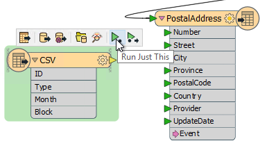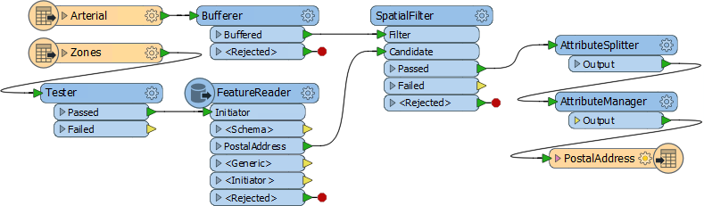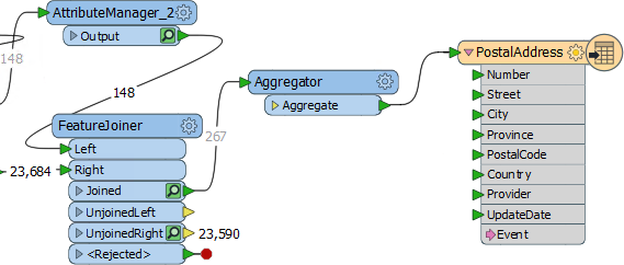 Connect the FeatureJoiner:Joined output port to the PostalAddress writer feature type: