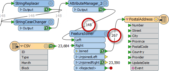 Interestingly, although 148 addresses enter the FeatureJoiner, 267 emerge from it: