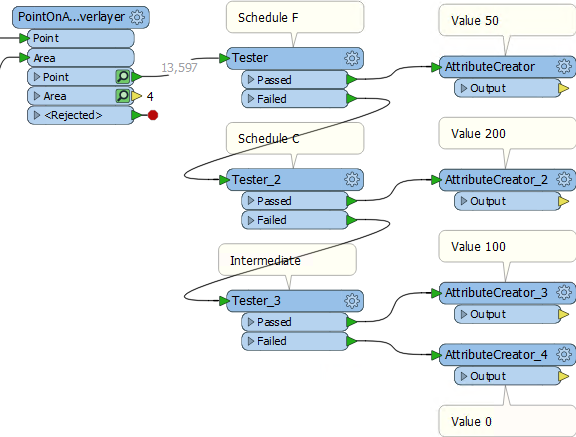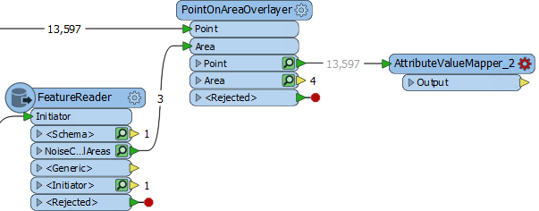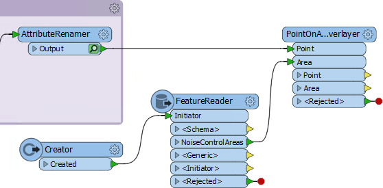 To do the overlay, add a PointOnAreaOverlayer transformer. Connect FeatureReader:<Initiator> to the Point input port, and FeatureReader:NoiseControlArea to the Area input port:
