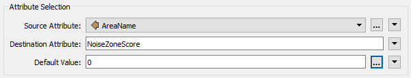 Inspect the AttributeValueMapper's parameters. Set it up to map from AreaName to NoiseZoneScore, with a default value of zero (0):