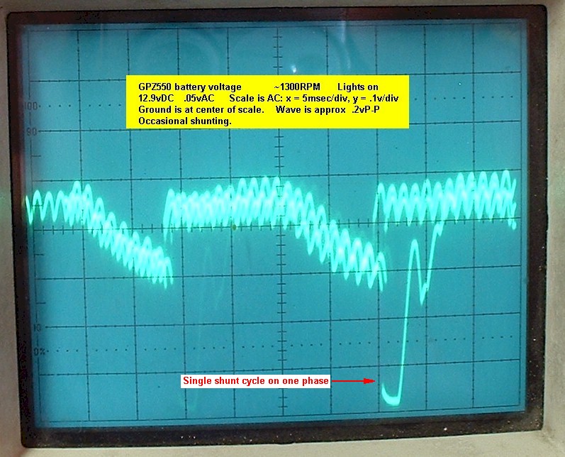 These are voltage waveforms from the charging system of a 1981 KZ550 D motorcycle. The first four are measuring the output of two legs of the 3-phase alternator. The second four are measuring one leg to ground. As marked, some were at 4000 RPM and some were at idle (1100, or 1200 rpm). Some were with the headlights (70watts total) on and some with the headlights off. Also, the AC voltage of the waveform, as measured by a sepaerate AC voltmeter, are indicated as well as the DC voltage of the battery.Fig. 1In some cases, the single oscilloscope trace shows two different waveforms overlayed. This is due to the operation of the voltage regulator on the motorcycle, the waveforms do actually change. Some cycles will be shunted and some won't. The oscilloscope shows the shunted and the non-shunted cycles seemingly at the same time. Obviously, they do not occur at the same time, the persistence of the phosphor screen causes that illusion.