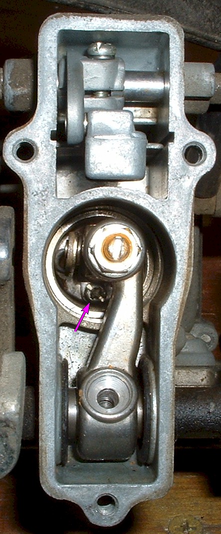 The second screw must be accessed with the slide raised nearly to the top of the carb body. The slide should be held up securely in order to press down on the screw head firmly.