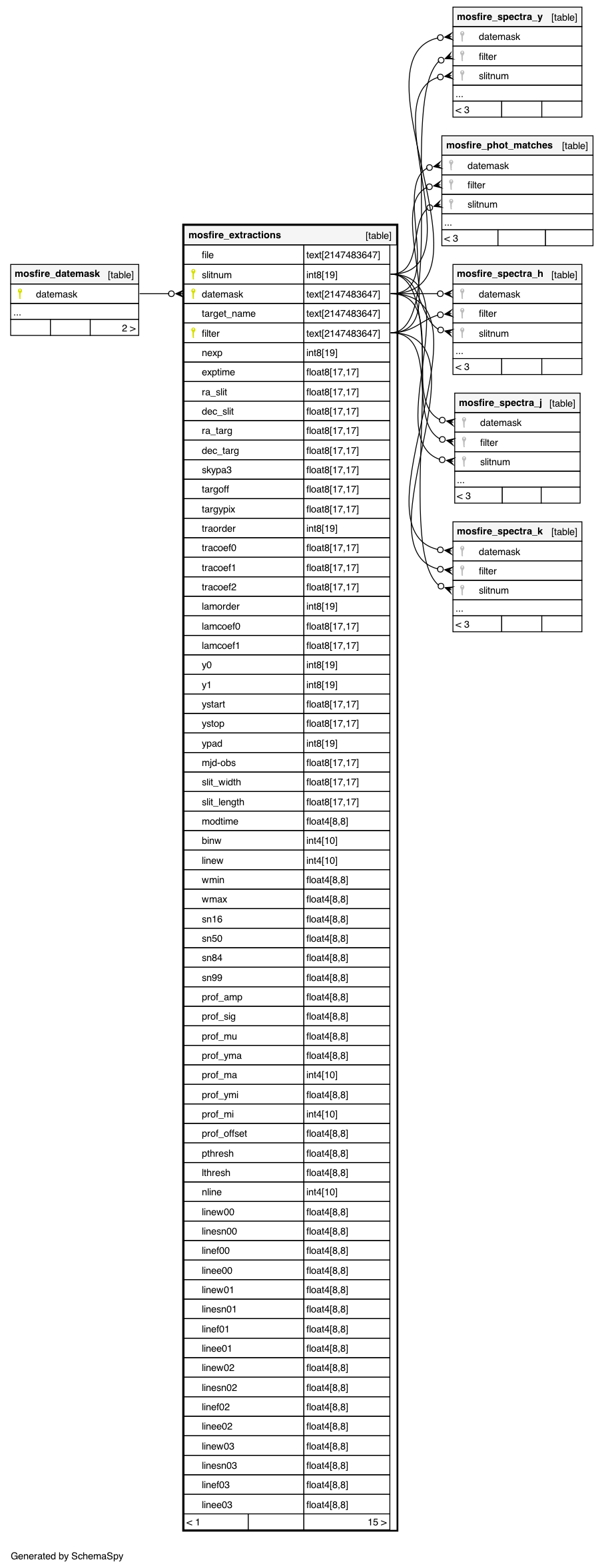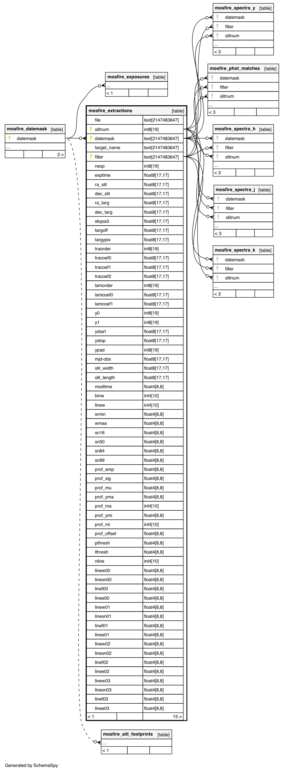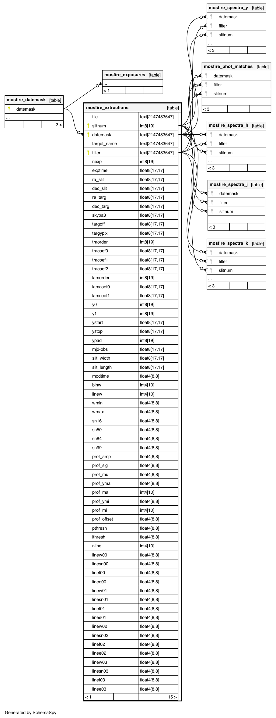| mosfire_extractions_pkey | Primary key | Asc/Asc/Asc | datemask + filter + slitnum |
