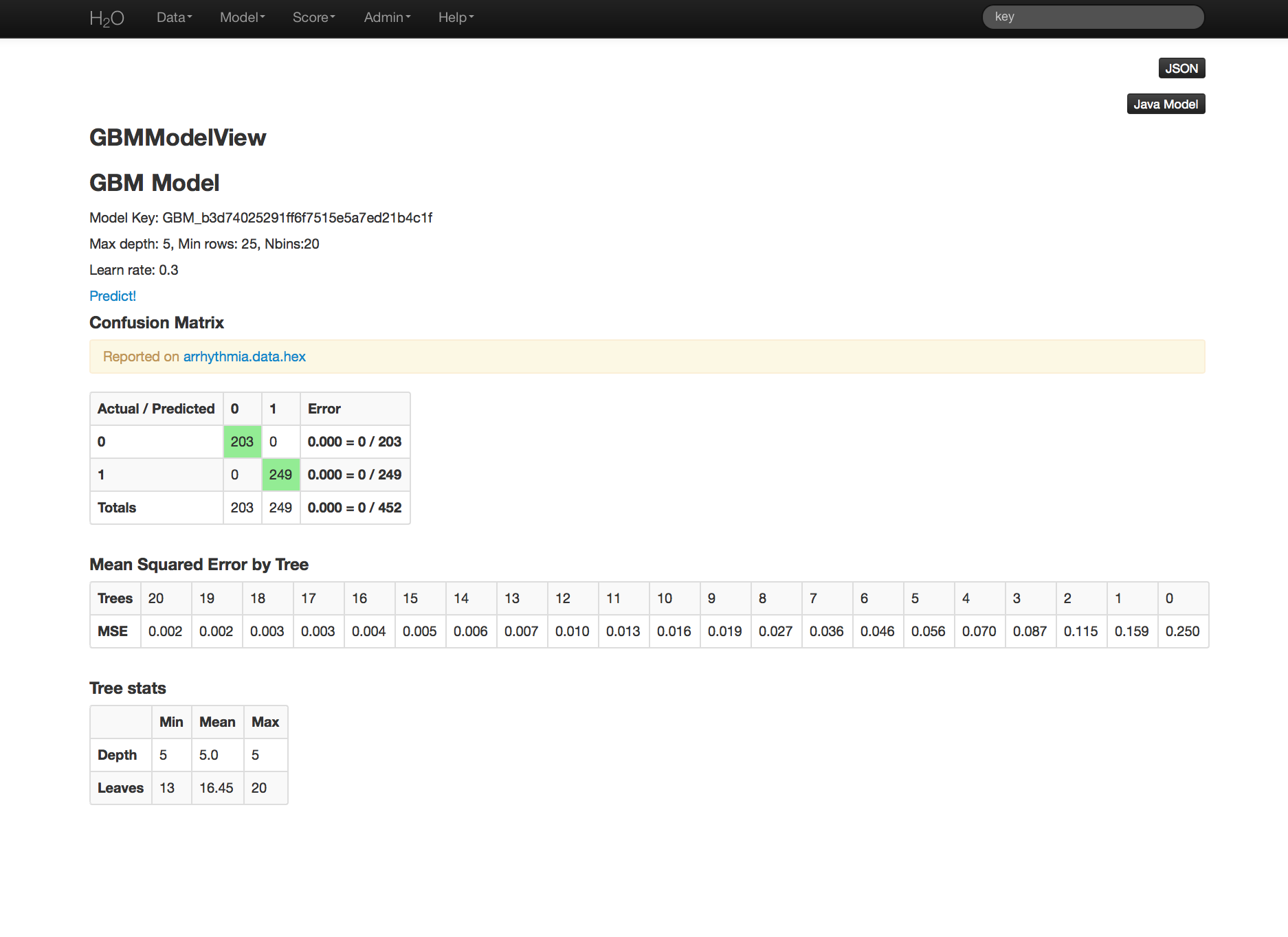 GBM output for classification returns a confusion matrix showing the classifications for each group, and the associated error by group and the overall average error. Regression models can be quite complex and difficult to directly interpret. For that reason only a model key is given, for subsequent use in validation and prediction. Both models provide the MSE by tree. For classification models this is based on the classification error within the tree. For regression models MSE is calculated from the squared deviances, as it is in standard regressions.