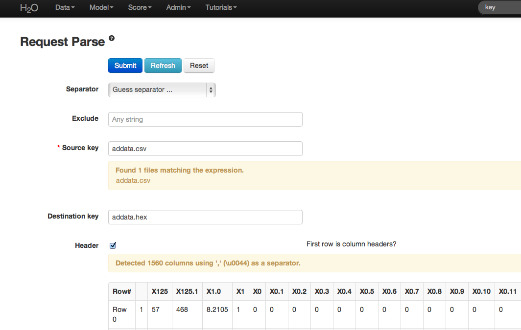 - Parsing data into H2O generates a .hex key (“data name.hex”).