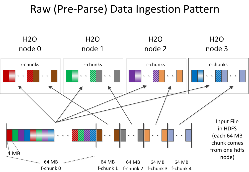 The data is moved a second time from the H2O node, where the raw data is parsed, to the H2O node, where the compressed data will reside in a Fluid Vector chunk (a p-chunk in the diagram below).