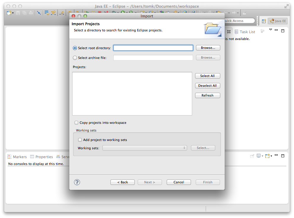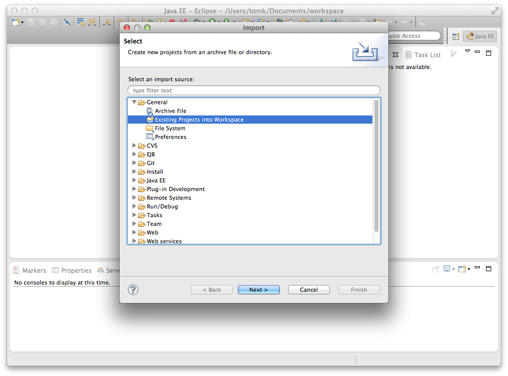 - Choose General->**Existing Projects** into Workspace.