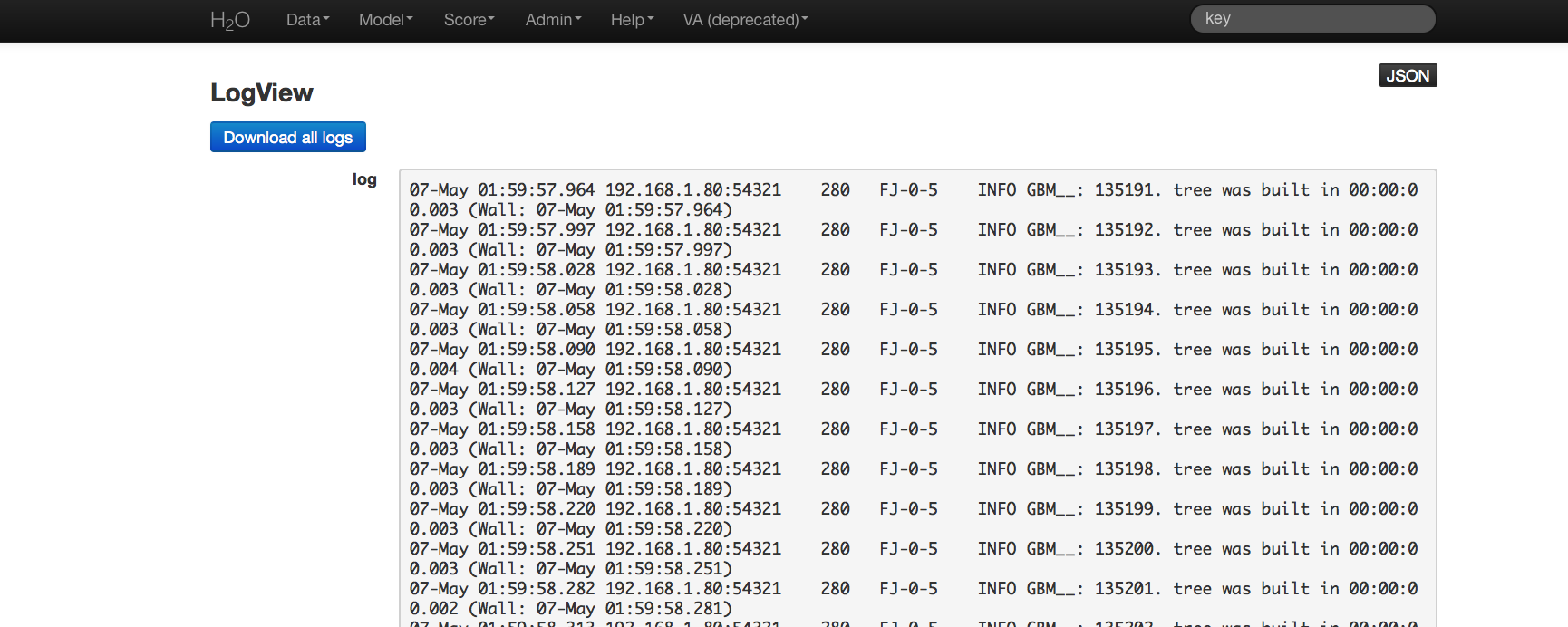 To inspect a log of all H2O activities, use the Inspect Log page. To download logs, click the Download All Logs button in the upper-left corner of the page.
