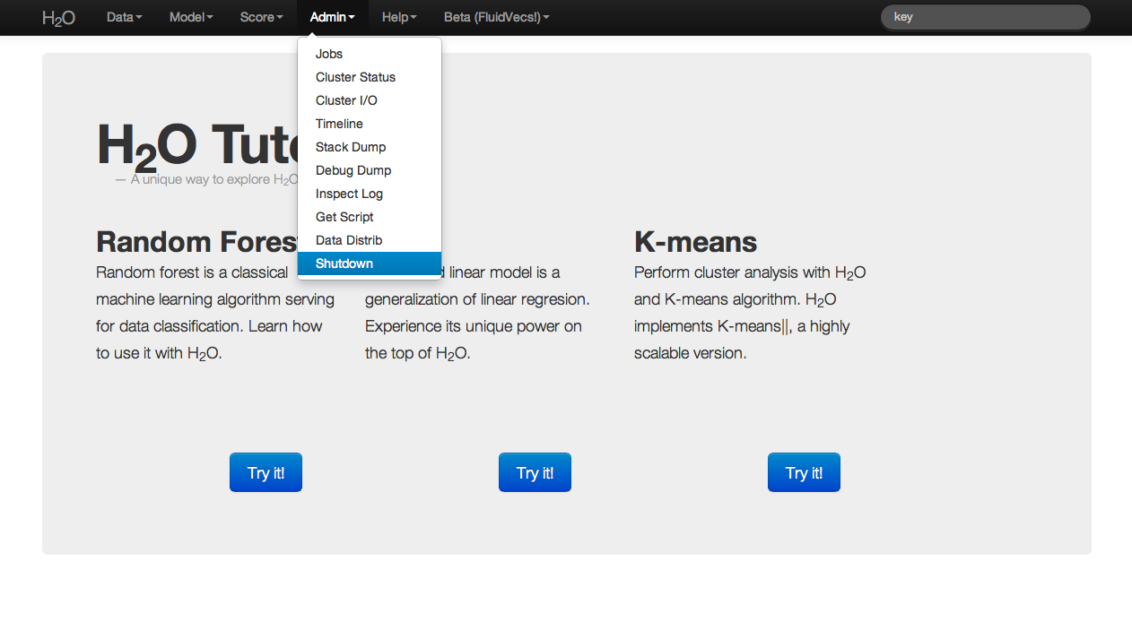 When you have finished running an H2O instance, exit by selecting Shutdown from the drop-down Admin menu.