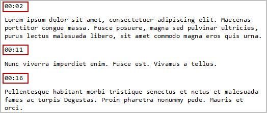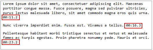 A 'timestamp' indicates a point in time. For example, two minutes (00:02:00) into an interview, Jane said, "I don't agree with the issues". You can enter timestamps as hh:mm:ss or mm:ss (where hh = hours, mm = minutes, and ss = seconds). Timestamps can optionally include tenths of a second.