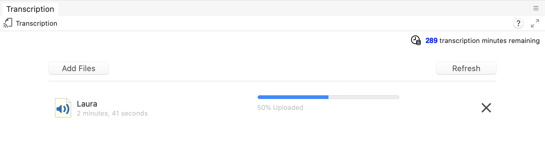 2. In the Transcription tab, click Add Files or drag and drop from the List View to add audio or video files to transcribe. Once added, the files automatically upload to NVivo Transcription on the web.