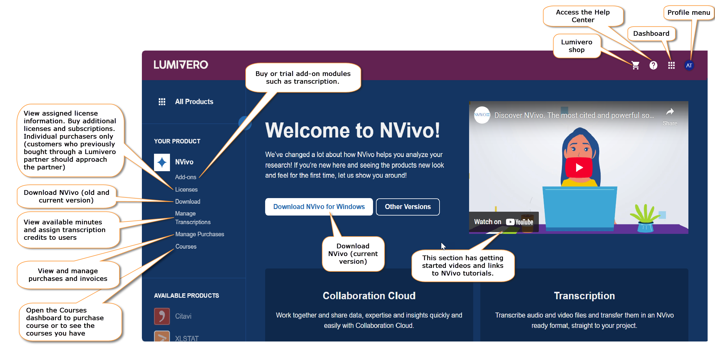 Use the myLumivero portal to buy NVivo products and manage your myLumivero profile and account. This topic describes the portal interface and the actions you can carry out from it—for a general description of myLumivero see myLumivero.