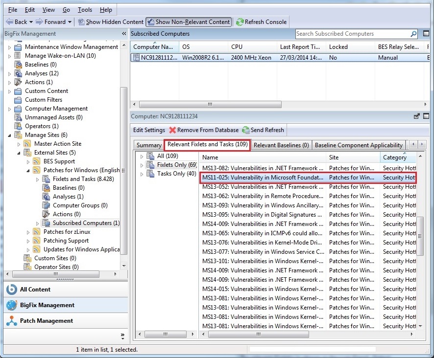 - Select the Relevant Fixlets and Tasks tab to display the