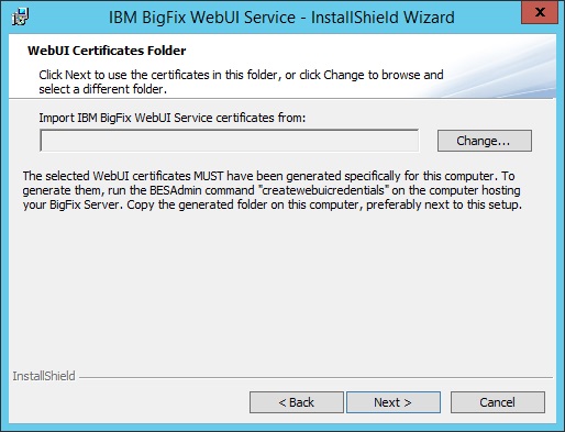 Note: The certificates must have been generated for the computer where you are installing the WebUI. To generate the certificates, run theBESAdmin.exe /createwebuicredentials