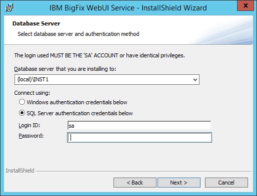 - Specify the BigFix database server and the related authentication method. You can connect to the