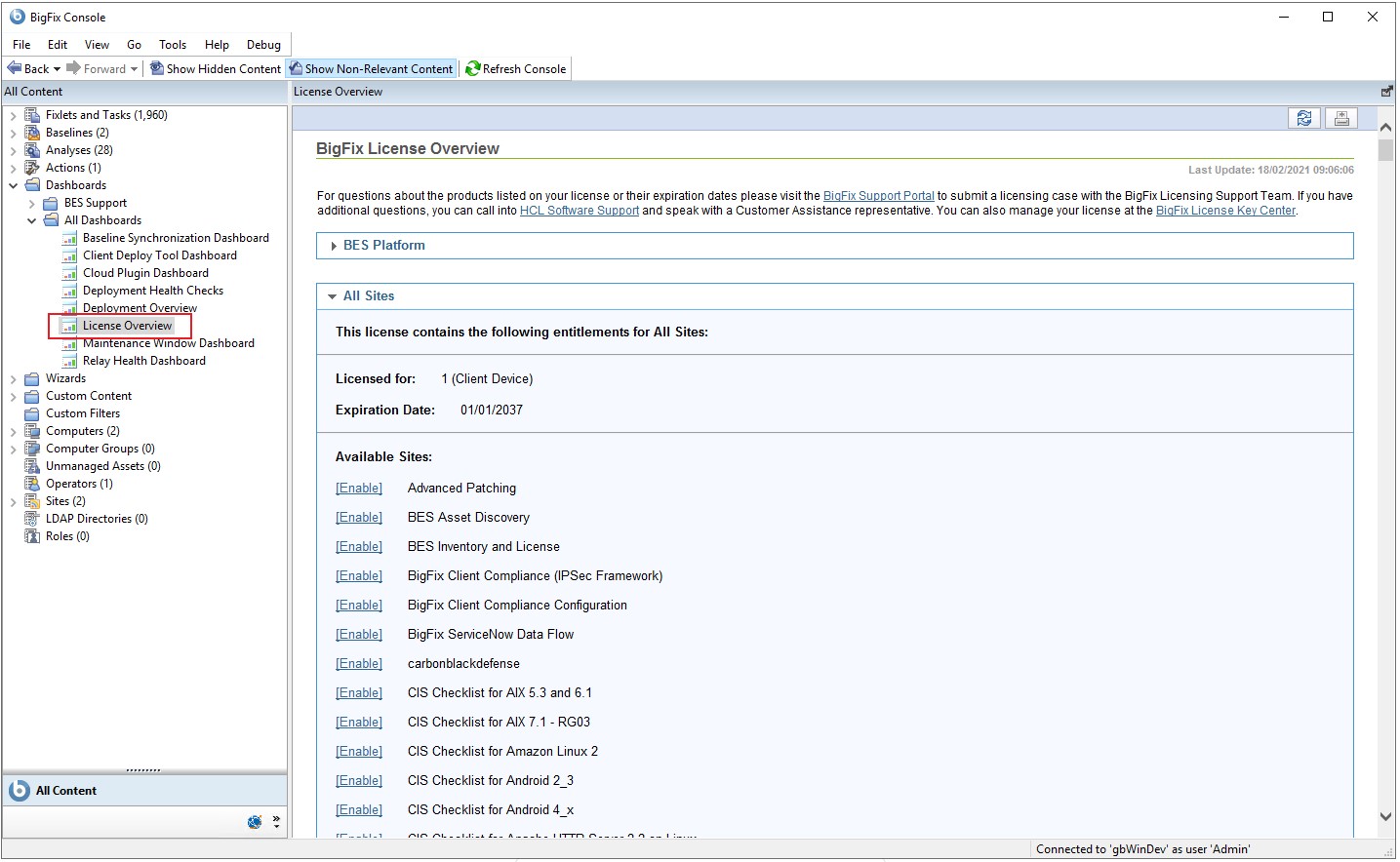 The License Overview dialog appears, listing available sites. - Enable the entitled sites by clicking the Enable