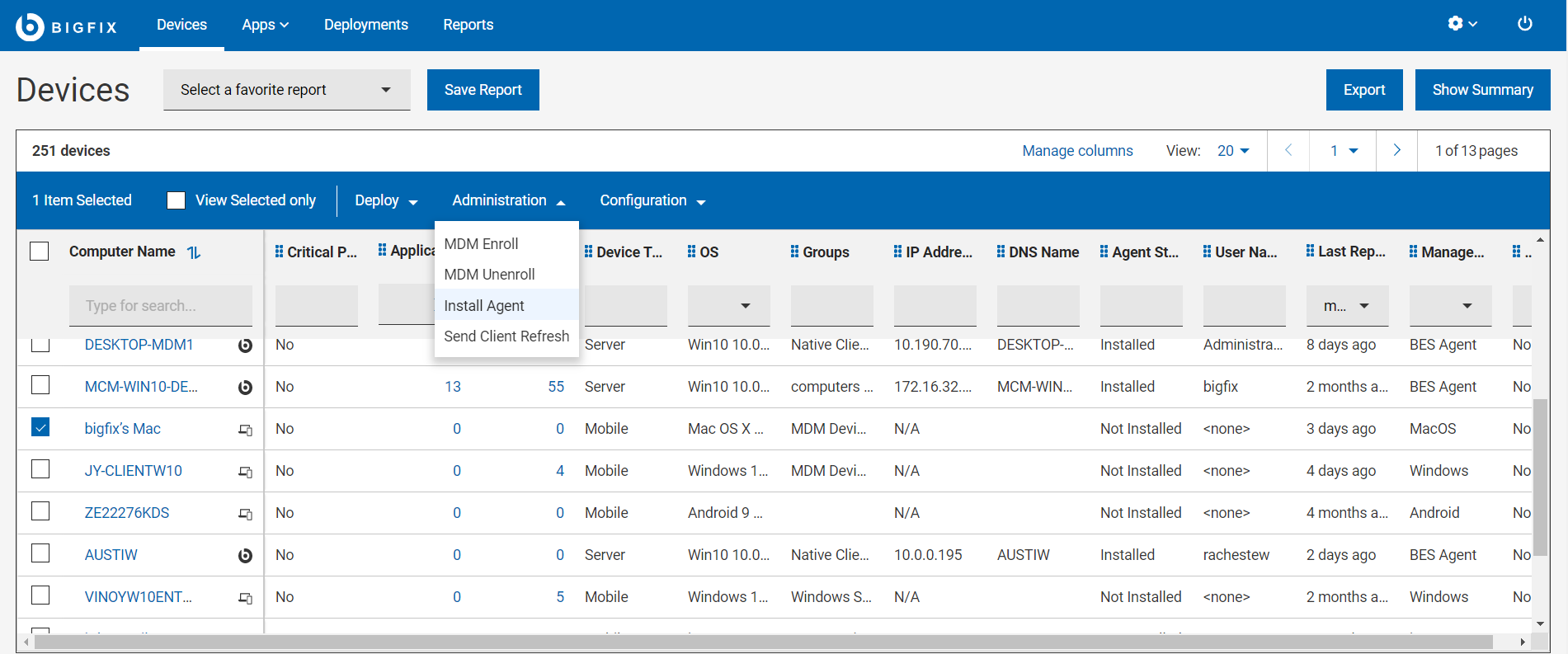 the device list, users can filter devices that do not have BigFix agent installed by using the filter.Note: The devices that are managed only by MCM are indicated by the MCM symbol