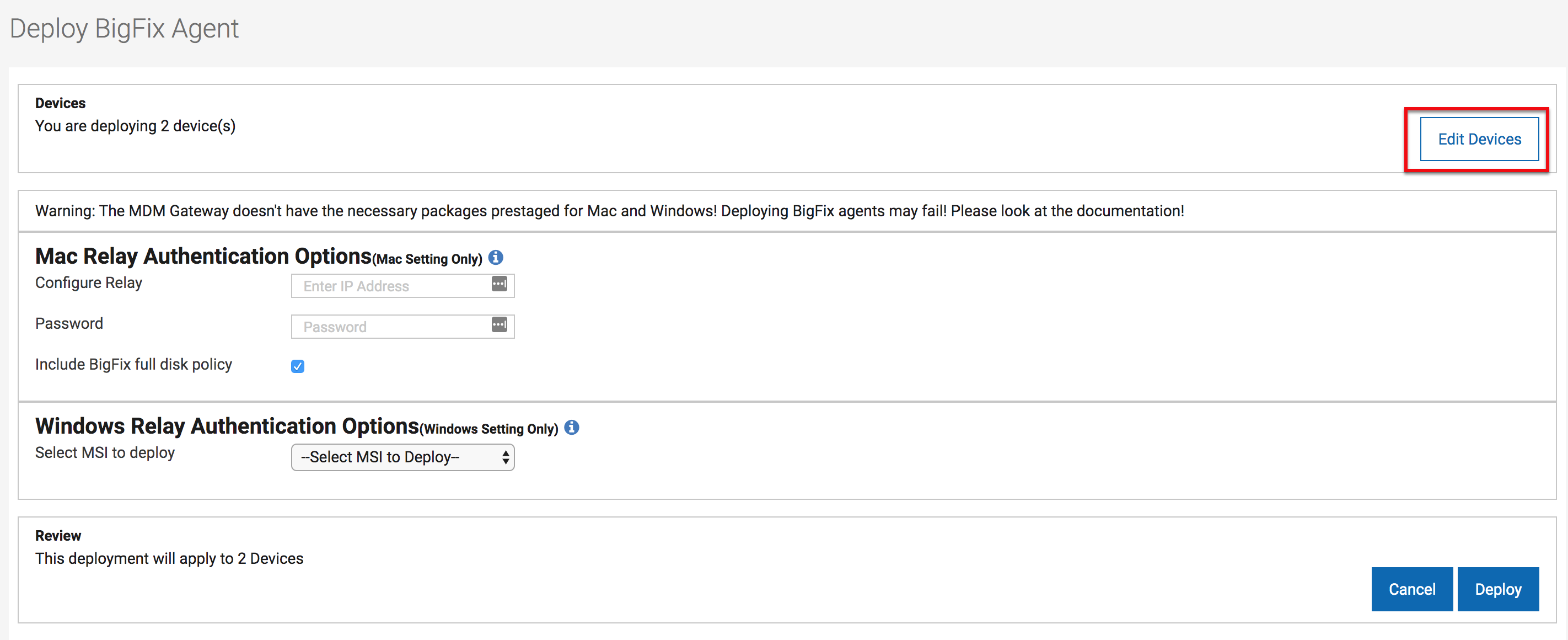 - To deploy the BigFix Agent, click Deploy.Note: