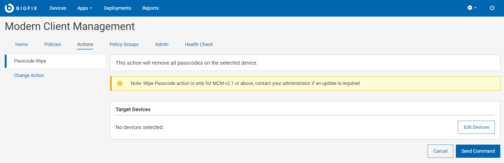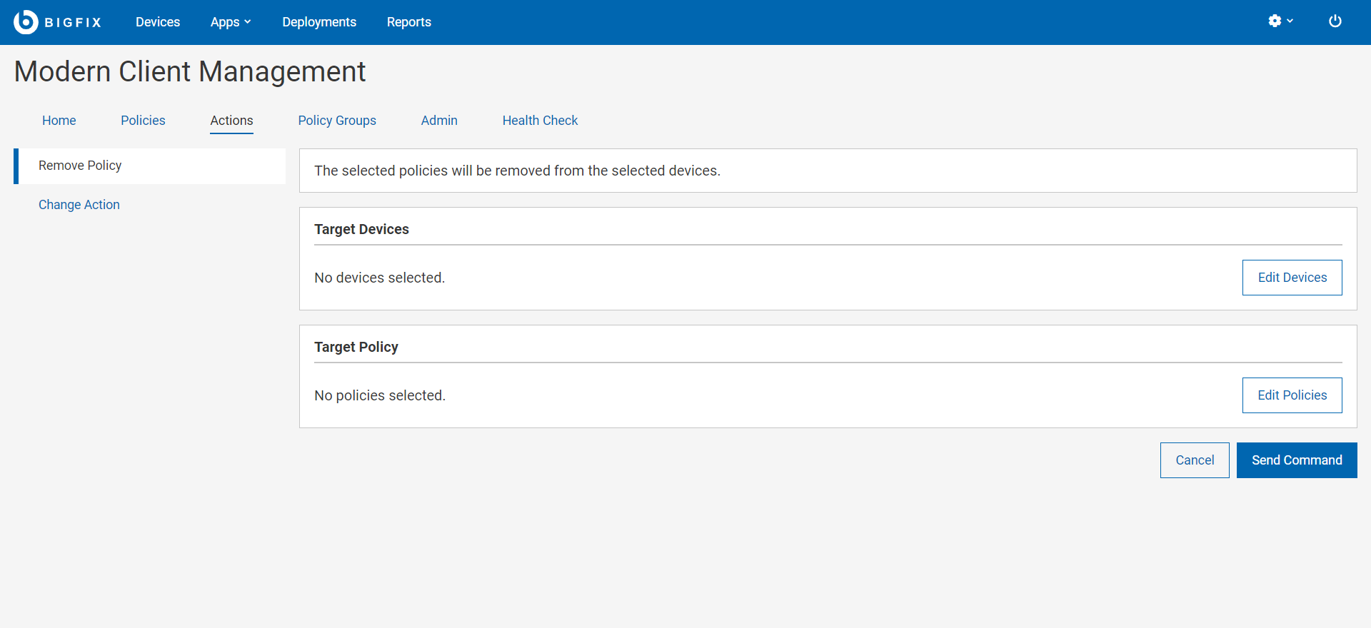 You can remove policies from selected devices using this action. You can only remove policies on devices that are enrolled in MCM and BigFix Mobile.