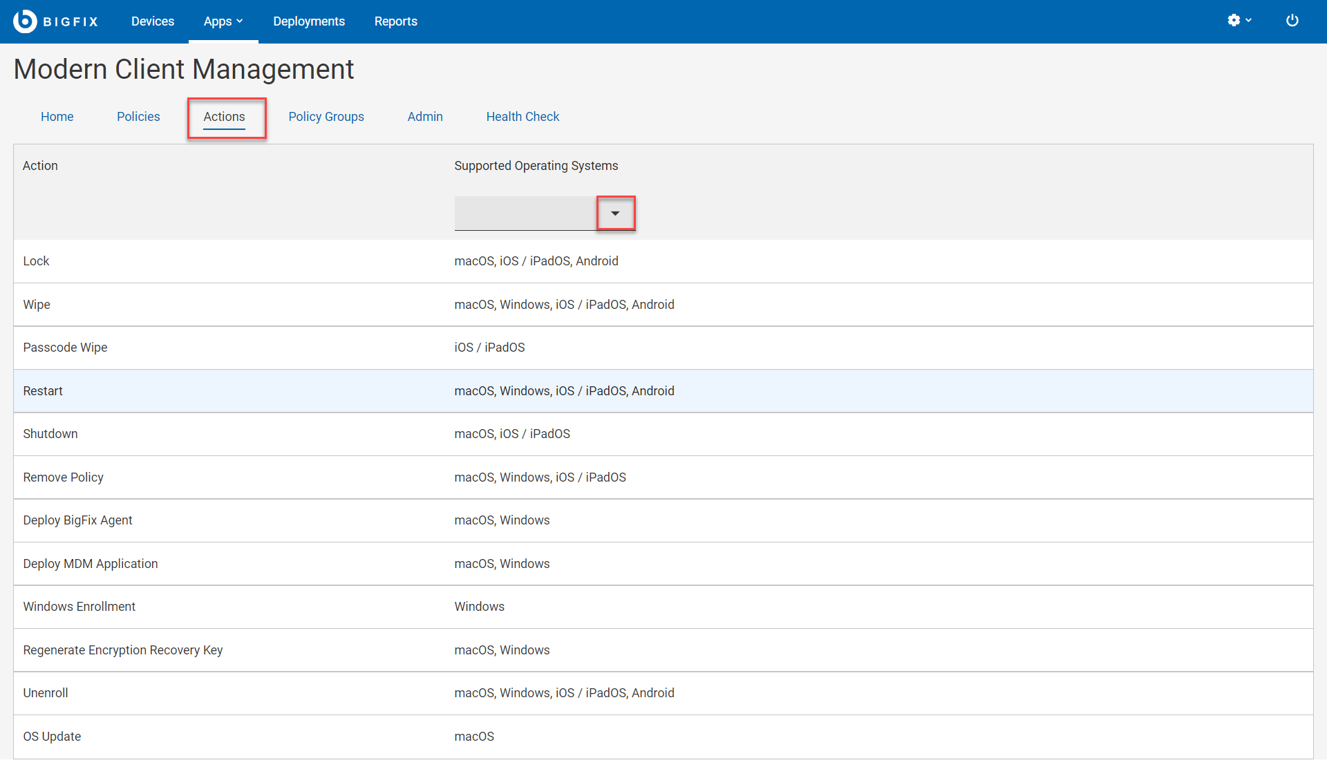 - The MDM Actions page displays all the possible actions along with the supported operating system for every action. You can also filter applicable actions by using the Supported Operating Systems filter. Click on the specific MDM action you want to deploy on MDM endpoints.