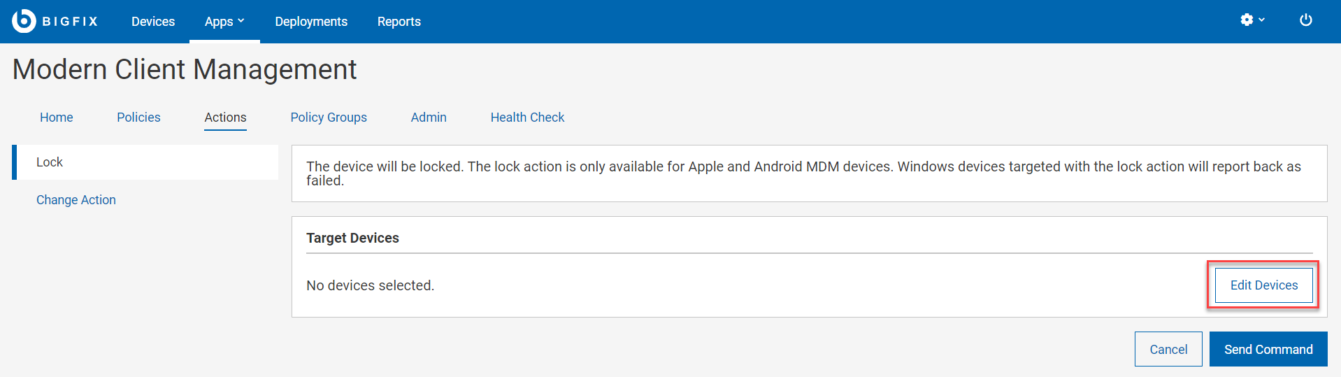 - Lock action is not applicable to Windows devices. The lock action deployed on Windows MDM devices does not lock those Windows devices, and this action reports as failed.