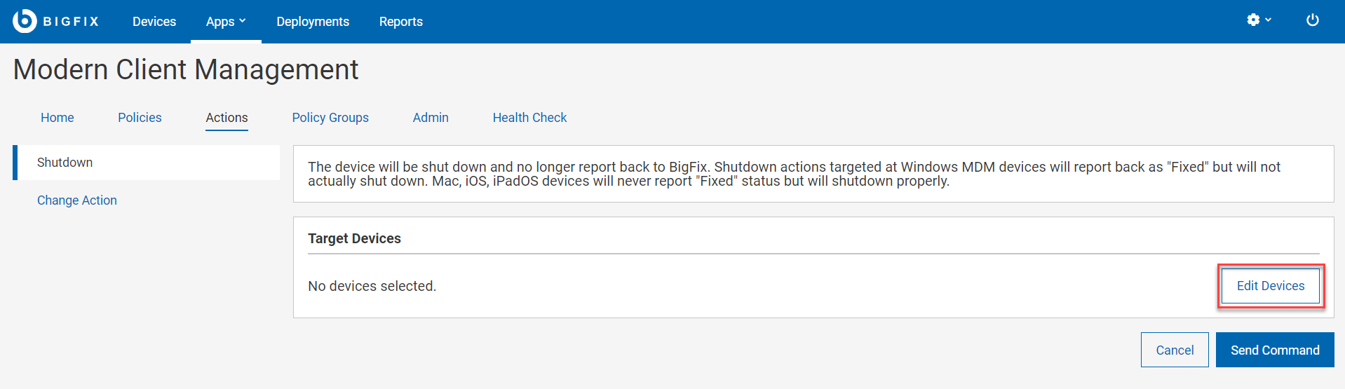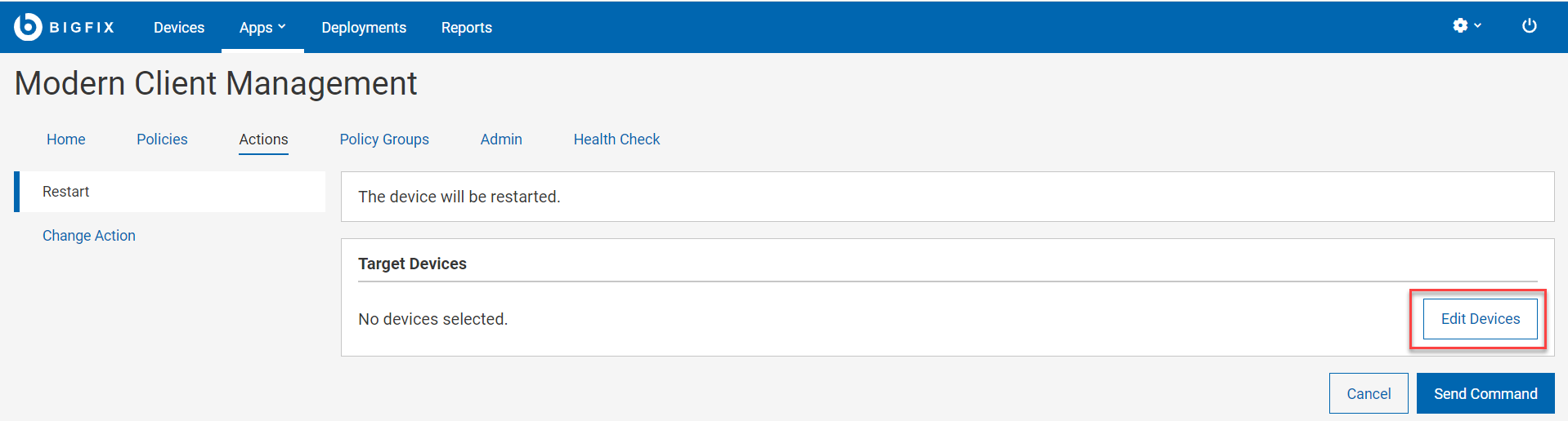 Use this action to send client refresh to devices.This action is available for all BigFix managed devices, regardless of whether the device is managed by MDM, by BigFix Native agent, or through cloud plugins.
