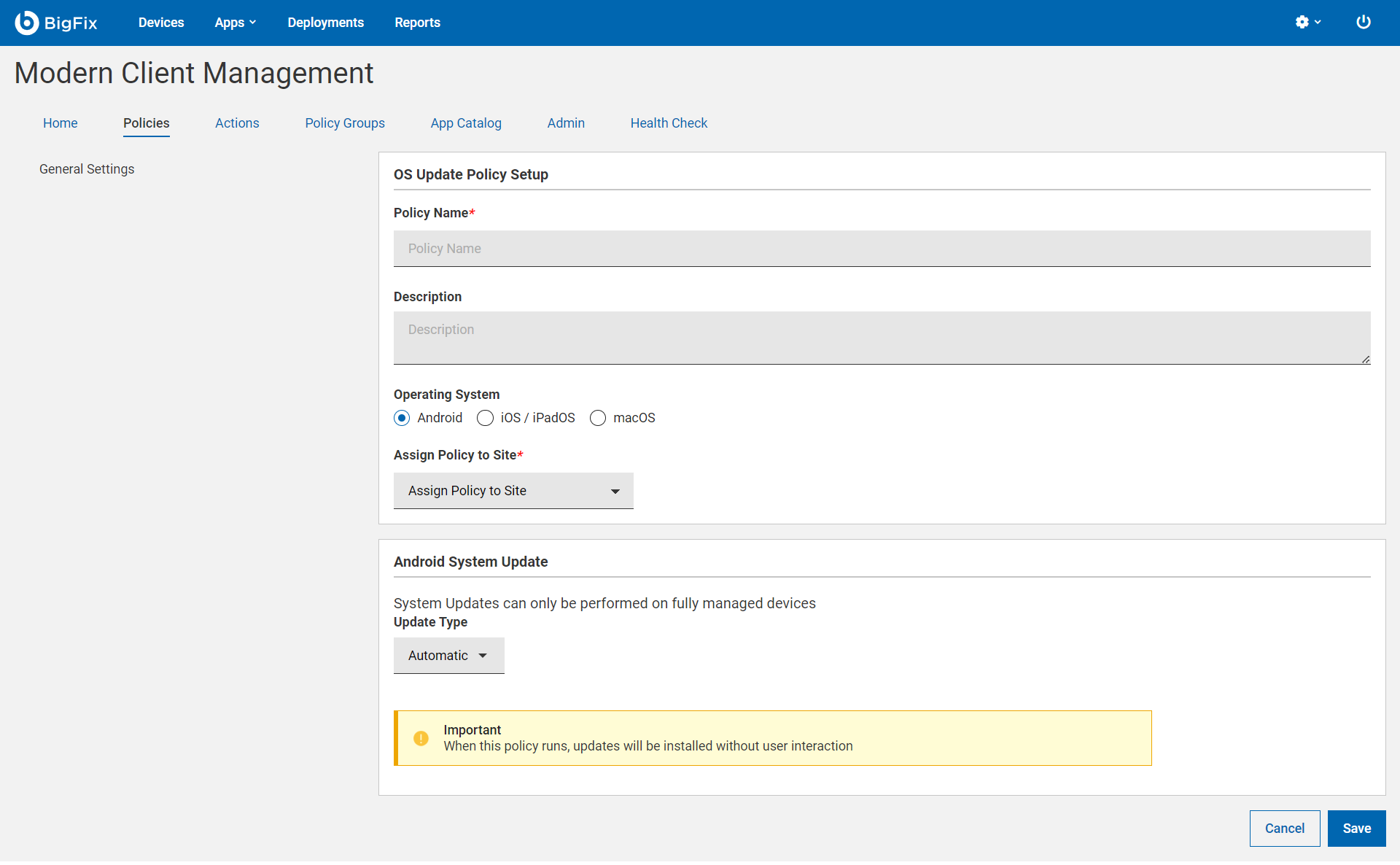 The OS update policy allows you to manage system updates for Android, macOS, and iOS/iPadOS devices. You can configure to install OS updates automatically or during a maintenance window. This allows you to install system updates without user interaction.