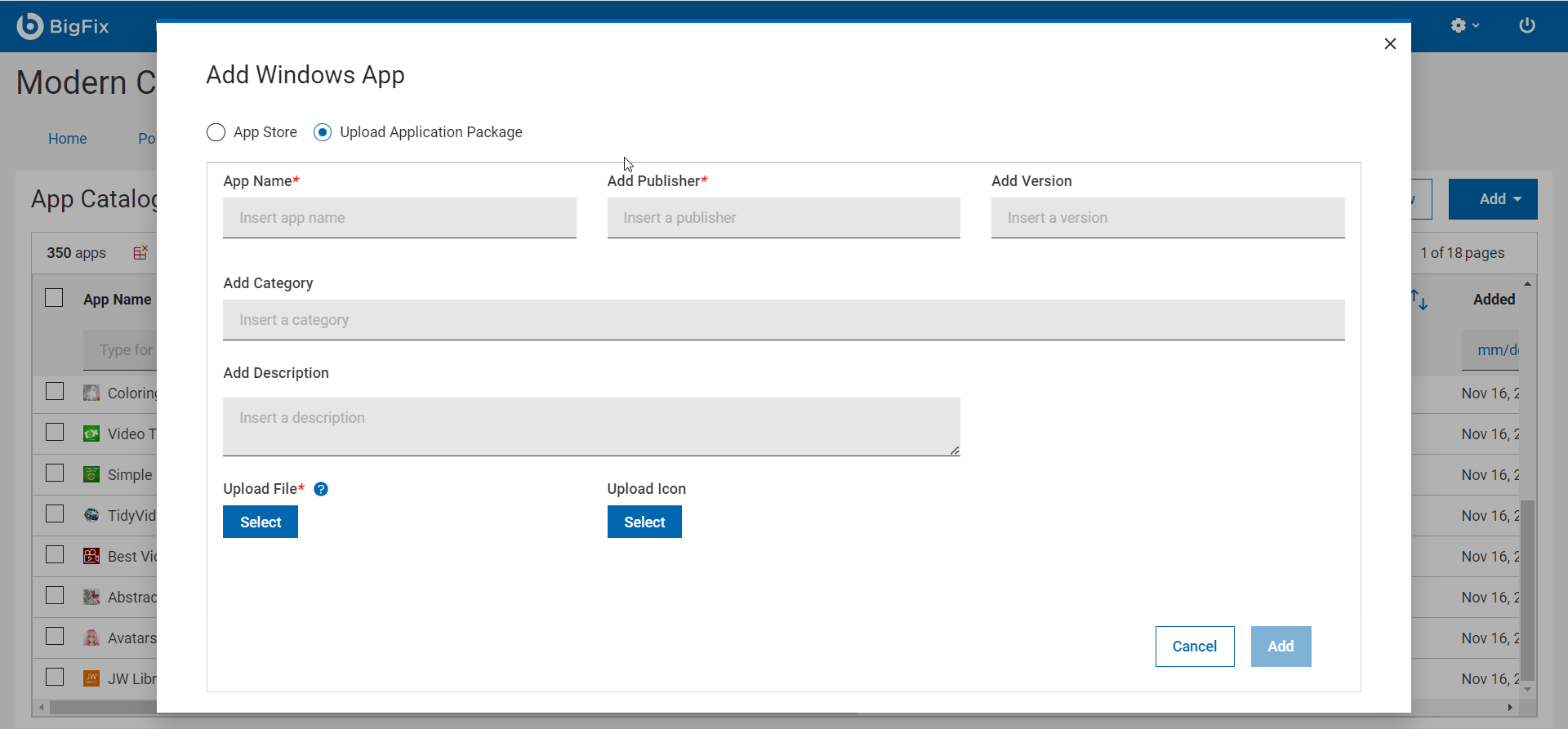 - From the App Catalog page, click the Add menu and select Windows.
