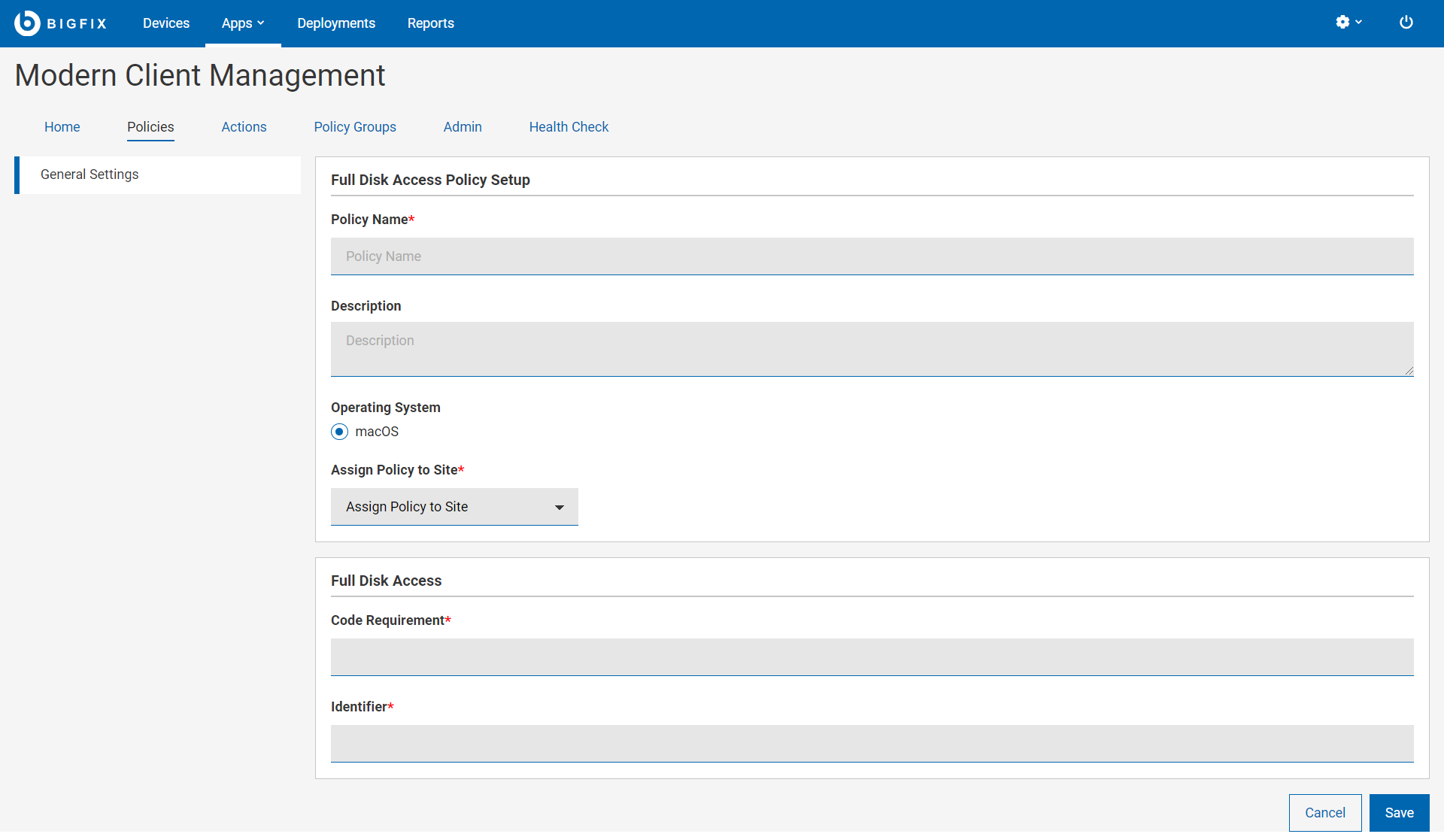 You can create a Full Disk Access policy using this section. Creating a Full Disk policy allows the BigFix Agent (and other applications) to function smoothly on OSX devices. Applications configured with a full disk policy are granted complete disk access on OSX.
