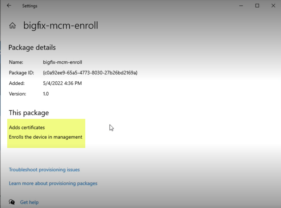 Results: After this action is completed, Windows ppkg file is created in the targeted Windows device at C:\MCMPPKG.