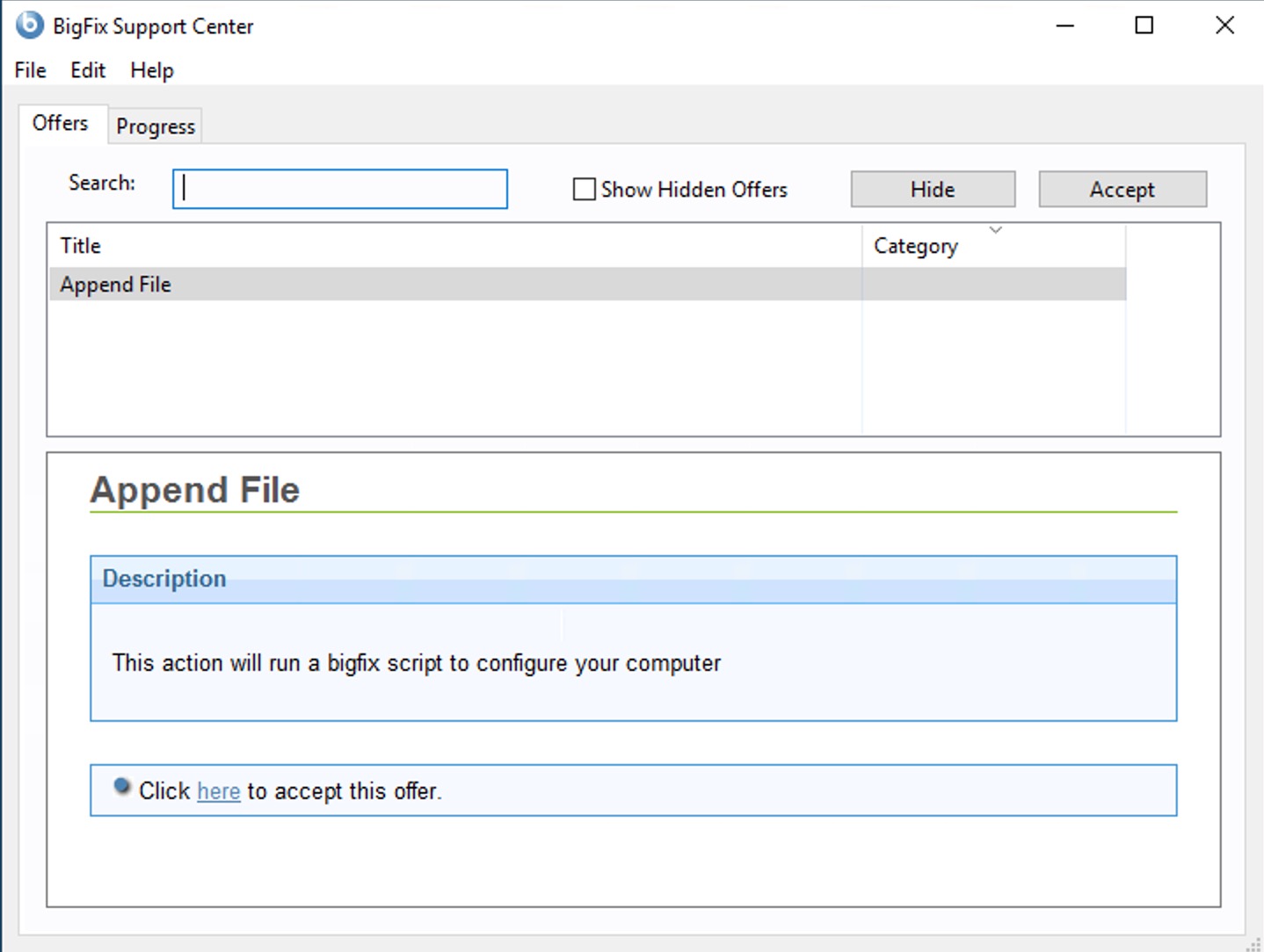 This topic describes in particular what the Client UI shows on the client computer when the Messages and Offer tabs of the Take Action panel are triggered from the BigFix Console.