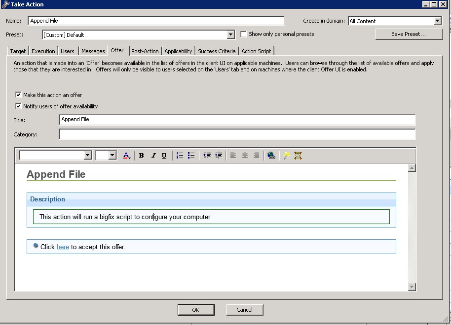 If the BigFix Console operator specifies the following settings in the Offer tab of the Take Action panel: