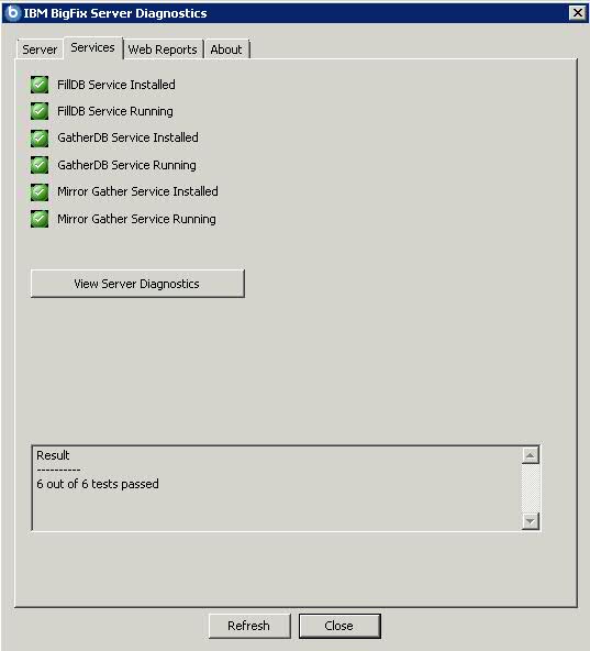 The IBM BigFix Diagnostics tool verifies that the server components are working correctly. It identifies components that are incorrectly configured or non-functional and displays the results. To run the diagnostics, follow these steps: