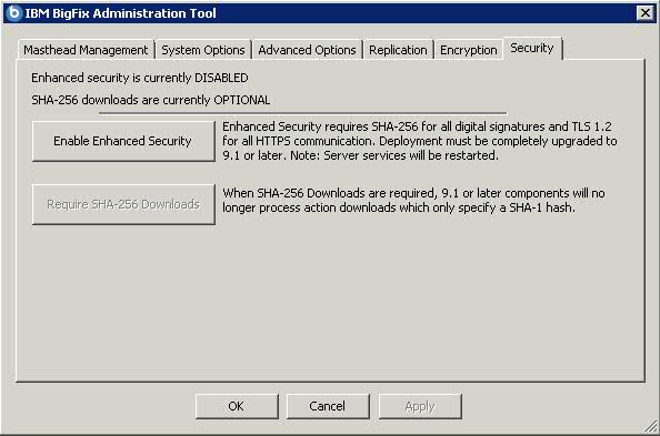service manually.If you click Enable Enhanced Security without selecting Require SHA-256 Downloads, the SHA-256 algorithm will be used to for digital signatures and for content verification, TLS 1.2 protocol will be used for communications among the Endpoint Manager components but you will still be able to download SHA-1 content from external sites.