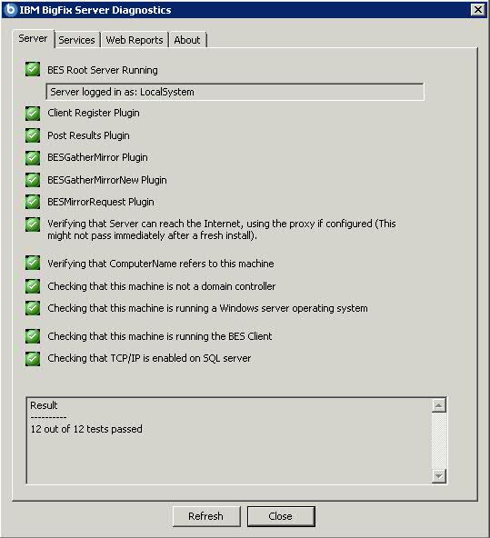 If all the buttons are green, click Close to exit the Diagnostic tool, otherwise address the problem to be sure that the server is working correctly. - On Linux: