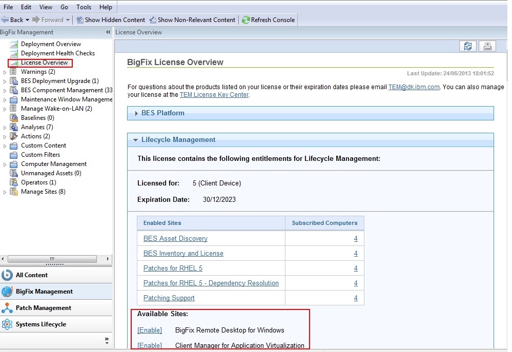 The License Overview dialog appears, listing available sites. - Enable the entitled sites by clicking the Enable