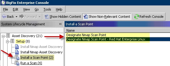 In the Setup node of the Asset Discovery navigation tree, click Install a Scan Point. A list of the scan point designation tasks are displayed in the List Panel on the right.
