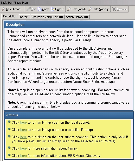 When the task opens in the work area, select one of the available links in the Actions box to initiate the Nmap scan. You can specify a local or large subnet.