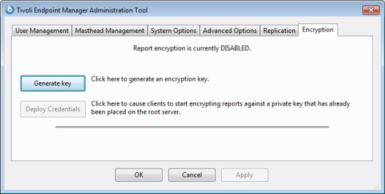 - This state indicates that no encryption certificate is included in your deployment masthead, which means that Clients cannot encrypt their reports even if they are told to do so. Click Generate Key to create an encryption certificate (and the corresponding private key, which can be used to decrypt reports at the receiving end). The state is set to Pending state.