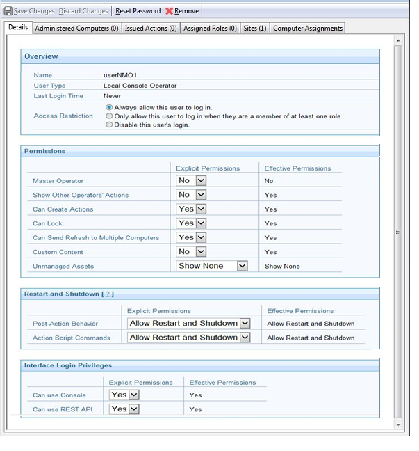 From this interface, you can grant a user Master Operator permissions. You can also determine whether or not you want to show this operator the issued actions of other operators, whether you want this operator to run actions or reboot on computers, create custom content, and see unmanaged assets. You can also set permissions to access the BigFix Console and REST API.