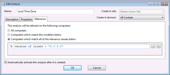 Select All computers or enter an expression that targets a subset of your networked Clients. Otherwise, you can set specific conditions or relevance clauses to limit the application of the Analysis.