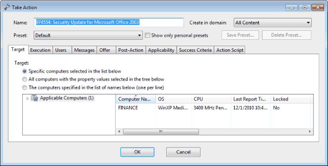 - Use the rest of the tabs to prepare your action, including execution schedules, client messages, extra scripting and more, then click the OK button. For more information, see the article on the Take Action dialog.