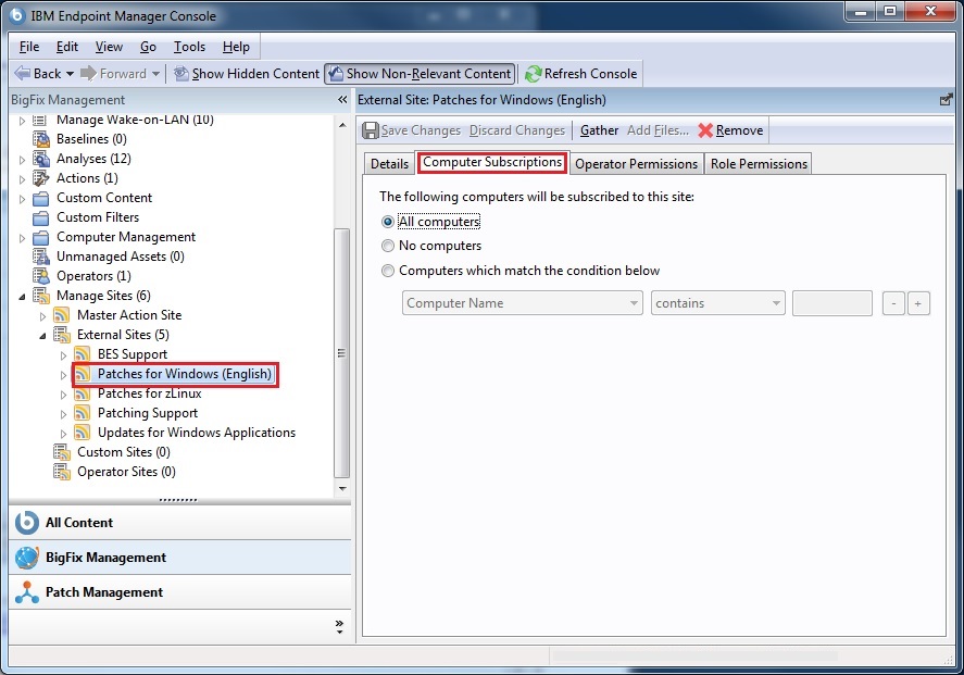 The Patch Management site is now listed in the Manage Sites node of the domain panel. - Open the Manage Sites node and select Patches for Windows (English).