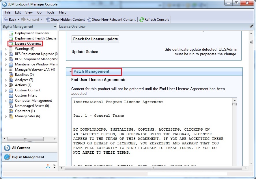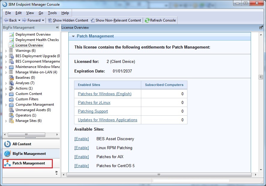 After installation, the IBM BigFix product is automatically set up to subscribe to certain management and maintenance sites. In this way content from those sites automatically flows into your enterprise and is evaluated for relevance on all computers running the IBM BigFix client.