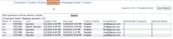 The Operator list is simple and straightforward. It contains a list of all the operators of your IBM BigFix deployment, displaying the type and management rights of each. This list cannot be edited, although you can filter it by the name of the operator.